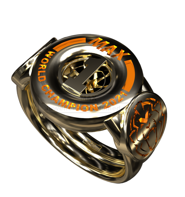 Op de band staat natuurlijk MAX Worldchampion 2021. Deze diepere tekst is gevuld met oranje hars, passend voor het land waar hij voor uitkomt Nederland!!!!